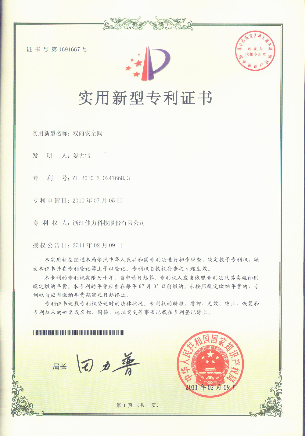 “雙向安全閥”四項發(fā)明 獲得 國家實用新型專利,由國家知識產(chǎn)權(quán)局頒發(fā)專利證書!