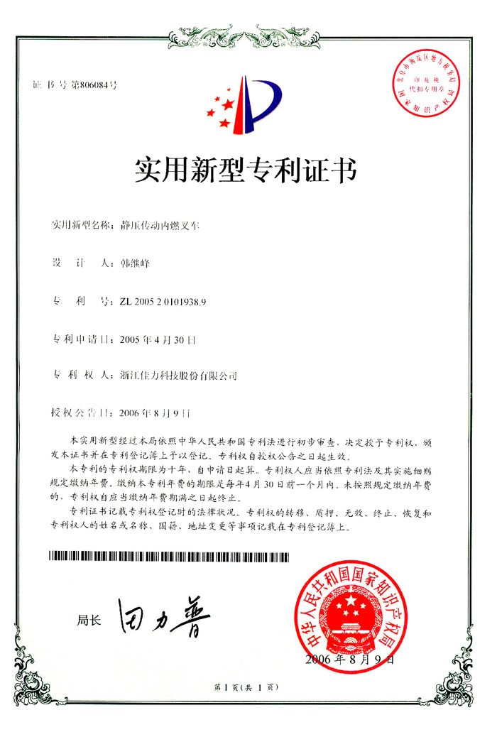 專利證書(叉車02)