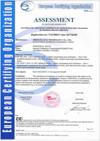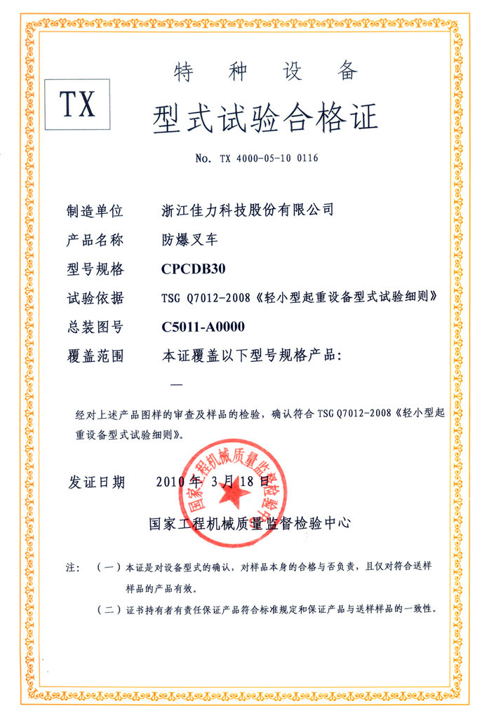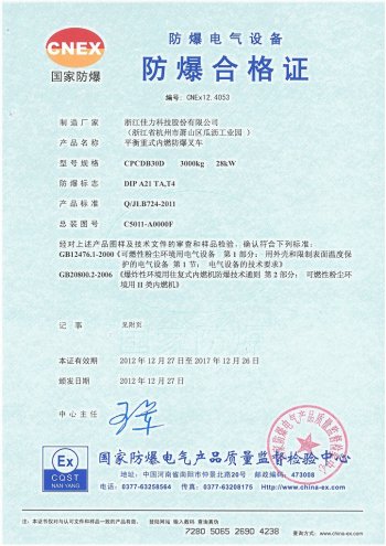 型 號 | 單位 | CPCD20 | CPCD25 | CPCD30 | CPCD35 | 額定起重量 | kg | 2000 | 2500 | 3000 | 3500 | 載荷中心距 | mm | 500 | 最大起升高度 | mm | 3000 | 門架傾角(前/后) | ° | 5/11 | 滿載最大行駛速度 | km/h | 17 | 最小轉(zhuǎn)彎半徑 | mm | 2250 | 2350 | 滿載爬坡度 | % | 20 | 18 | 外型尺寸 | 長 | mm | 3678 | 3808 | 寬 | 1295 | 高 | 2180 | 自重 | kg | 4200 | 4450 | 4510 | 4750 | 取得認(rèn)證 | - | 型式試驗認(rèn)證、防爆認(rèn)證、CE認(rèn)證 | 防爆標(biāo)志 | - | ExⅡ2G ⅡBT4/ DIP A21 TA,T4 | 適用防爆區(qū)域 | - | 1區(qū)、2區(qū)和21區(qū)、22區(qū) | 爆炸性氣體組別 | - | IIB | 溫度級別 | - | 135?C (T4) | 認(rèn)證機構(gòu) | - | 國家防爆電氣產(chǎn)品質(zhì)量監(jiān)督檢驗中心(中國南陽) |