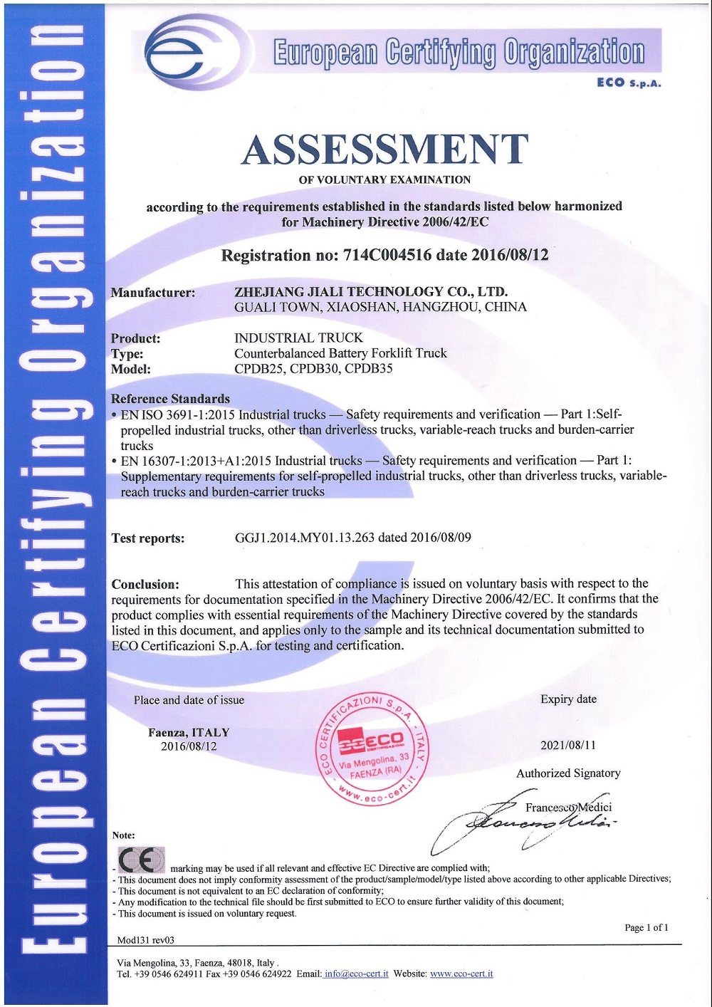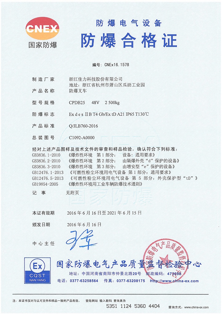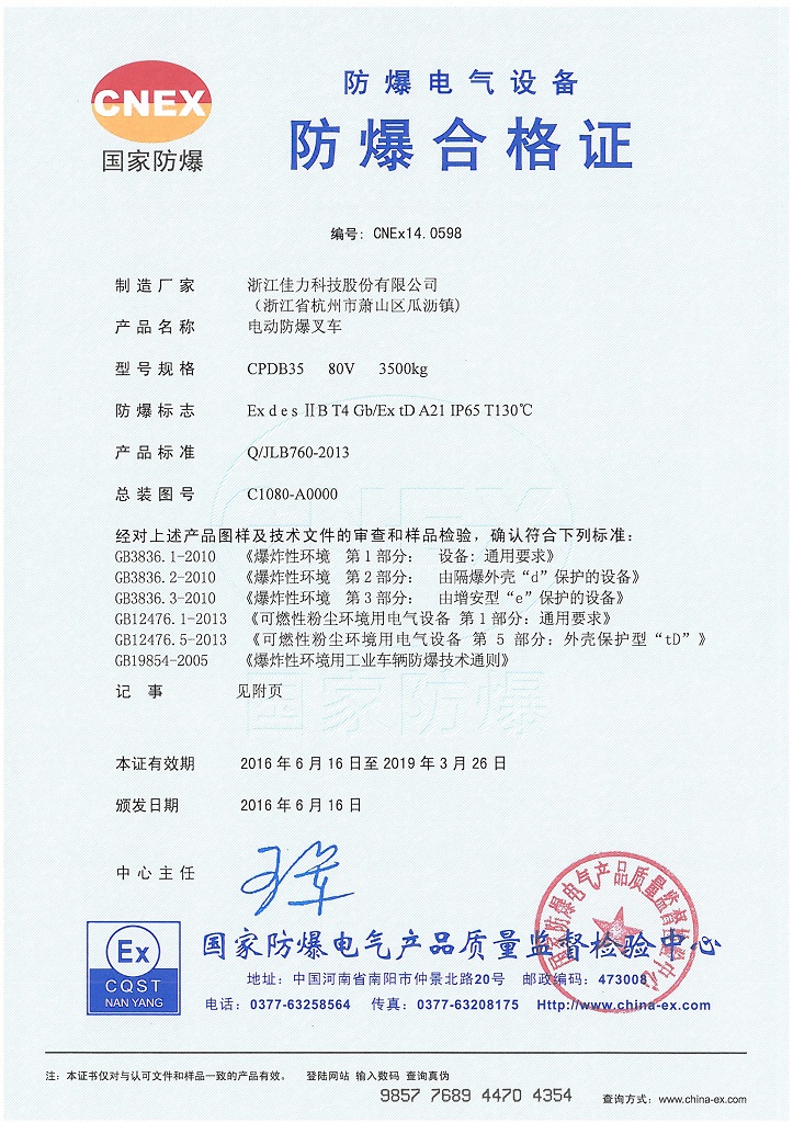 型 號(hào) | 單位 | CPDB20 | CPDB25 | CPDB30 | CPDB35 | 額定起重量 | kg | 2000 | 2500 | 3000 | 3500 | 載荷中心距 | mm | 500 | 最大起升高度 | mm | 3000 | 門架傾角(前/后) | ° | 6/12 | 最小轉(zhuǎn)彎半徑 | mm | 2110 | 2270 | 滿載爬坡度 | % | 15 | 13 | 外型尺寸 | 長(zhǎng) | mm | 3435 | 3605 | 寬 | 1200 | 1250 | 高 | 2150 | 2160 | 2170 | 自重 | kg | 4000 | 4600 | 4870 | 5050 | 取得認(rèn)證 | - | 型式試驗(yàn)認(rèn)證、防爆認(rèn)證、CE認(rèn)證 | 防爆標(biāo)志 | - | Ex desⅡBT4/Ex tD A21 IP65 T130℃ | 適用防爆區(qū)域 | - | 1區(qū)、2區(qū)和21區(qū)、22區(qū) | 爆炸性氣體組別 | - | IIB | 溫度級(jí)別 | - | 135?C (T4) | 認(rèn)證機(jī)構(gòu) | - | 國(guó)家防爆電氣產(chǎn)品質(zhì)量監(jiān)督檢驗(yàn)中心(中國(guó)南陽(yáng)) |